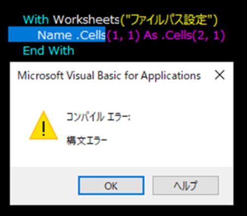 WithステートメントでWorksheetを参照中に、Name .Cells(1, 1) As .Cells(2, 1)のような記述を実行しようとすると、構文エラーが発生します。原因は不明ですが、Nameの直後に「.」を打つことはできないようです。Name (.Cells(1, 1))とやれば解決します。