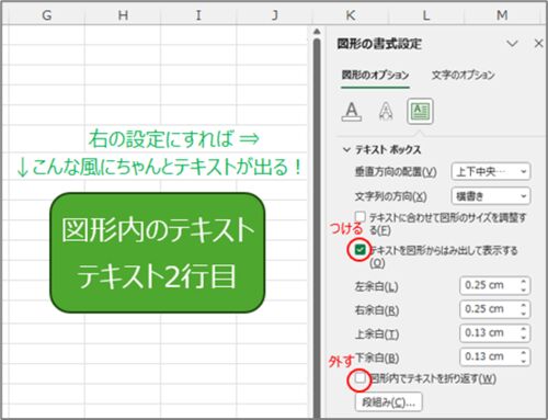 図形内テキストが不要な位置で改行されてしまう問題は「テキストを図形からはみ出して表示する」「図形内でテキストを折り返す」の設定である程度抑えることができます。これを一括実行するマクロを紹介します。
