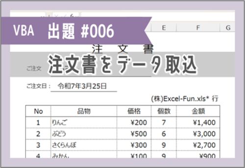 コミュニティ「Excel-Fun.xls*」にて毎月出題される、VBAの問題に対する私の回答ソースコードを掲載いたします。今回掲載するコードは本ブログで基本問題集としても出題した「注文書をデータ取込」問題です。