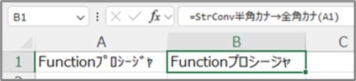 文字列中の半角カナを全角カナに変換する場合は、StrConv関数を使用します。しかし半角⇒全角を行う引数vbWideはすべての半角文字を変換してしまうため、半角英字や半角数字をそのままにする処理が必要です。